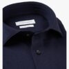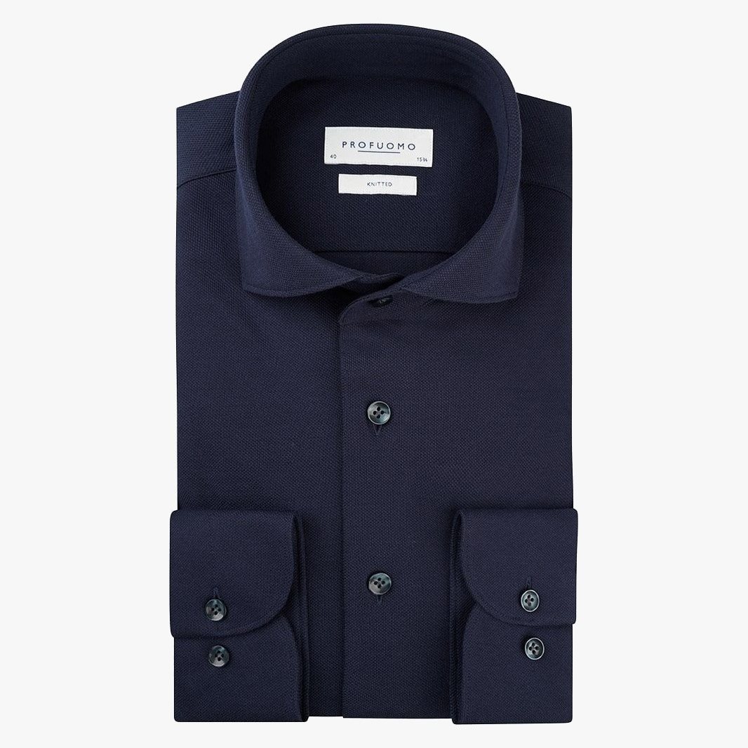 Dit effen overhemd van Profuomo is in de donker blauwe kleur. Het is een gebreid overhemd en heeft een spread kraag. De pasvorm is slim fit en heeft blauwe knopen en de stof is dikkere gebreide stof