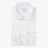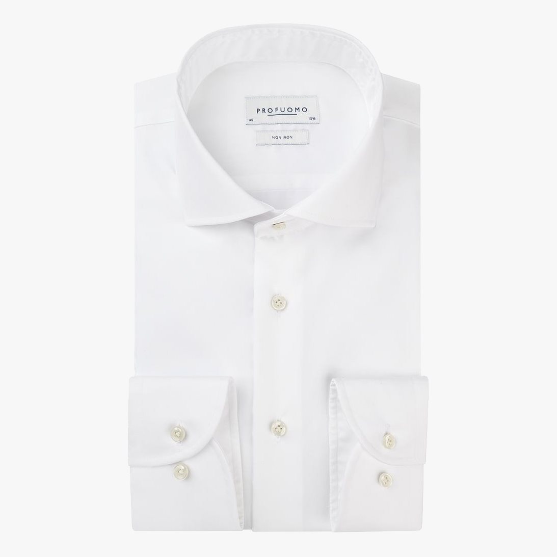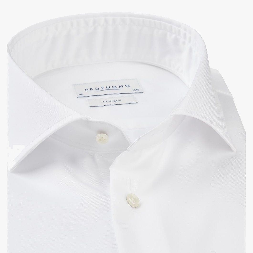 Dit effen overhemd van Profuomo is in de kleur wit. Het is een strijkvrij overhemd en heeft een spread kraag. De pasvorm is slim fit en heeft witte knopen
